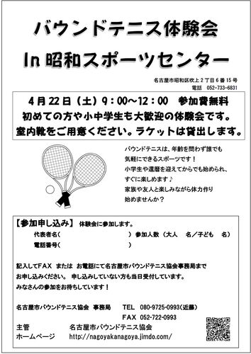 4月22日(土)昭和スポーツセンターにて 9時~12時まで、1日体験会を行います。 参加費は無料、お子様や初めての方も 大歓迎です。 案内は近日中に各クラブへお渡しいたします。 近隣の方へのチラシ配布も予定しています。たくさんの方の参加をお待ちしてい…