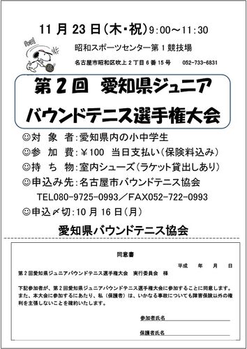 11月23日(木・祝)9:00~11:30昭和SCにて 第2回ジュニアバウンドテニス選手権大会を 行います。9月のジュニア選手練習会から案内を配布します。 申し込みには保護者の同意書をお願いします。 用紙はダウンロードもできます。たくさんのジュニアの参加を待…