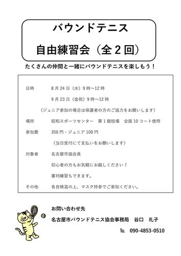 8月24日(水)と、9月23日(金祝)9時~12時、昭和スポーツセンターにて自由練習会を行います。当日まで参加人数がわからないので、練習内容はその場で決定しますが、スポーツ広場と同じような内容で進める予定です。 初心者は、別コートで球出し。 経験者は…